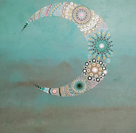 Unique turquoise, gold and white painting incorporating a mandala crescent moon.